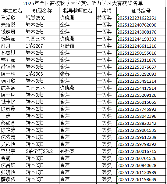 全校共有200多名学生参加了比赛。经过激烈角逐,一批听力能力突出、临场应变出色的同学脱颖而出,展现了我校学子扎实的语言功底和良好的学习风貌。经过省级组委会的综合评分排名,我校共有75名学生获奖。其中有1名同学获得特等奖,32名同学获得一等奖,42名同学获得二等奖。